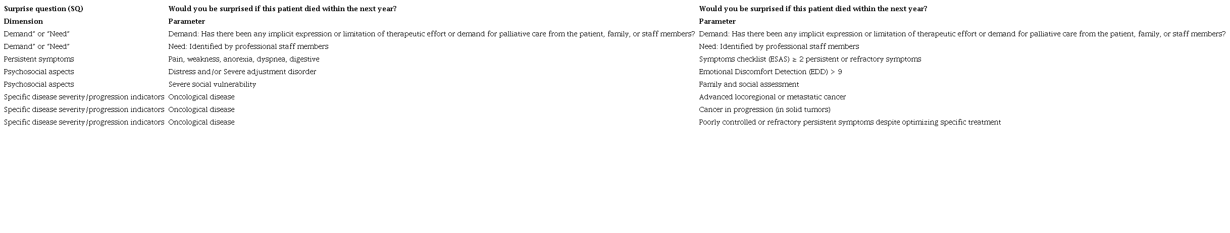 In the final version, the instrument was integrated with the SQ Would you be surprised if this patient died within the next year and eight parameters belonging to four dimensions distributed, thus: the dimension Demand or Need was comprised by the parameters Demand: Has there been any implicit expression or limitation of therapeutic effort or demand for palliative care from the patient, family, or staff members? and Need: identified by the professional staff members, the dimension Persistent symptoms remained with the parameter Symptom checklist (ESAS) ≥ 2 persistent or refractory symptoms, the dimension Psychosocial aspects was integrated by both parameters from the original version Emotional Discomfort Detection (EDD) > 9 and Family and social assessment and the dimension Specific disease severity/progression indicators was comprised by the parameters Oncological disease (Advanced locoregional or metastatic cancer), Oncological disease (in progression (in solid tumors) and Oncological disease (Poorly controlled or refractory persistent symptoms despite optimizing specific treatment). The final results are indicated in Table 4.