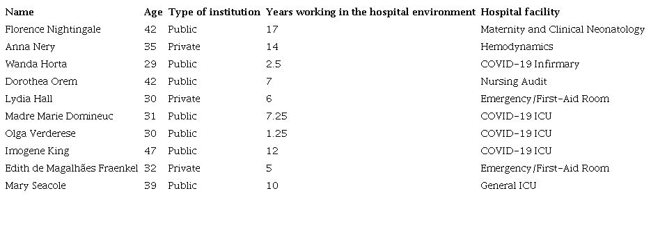 The participants were women, ages ranging from 29 to 47 years, with 1 to 17 years of experience in the hospital area, 7 working in public institutions and 3 in private ones. Of these, 3 worked in the COVID-19 ICU and the others can be seen in Table 1.