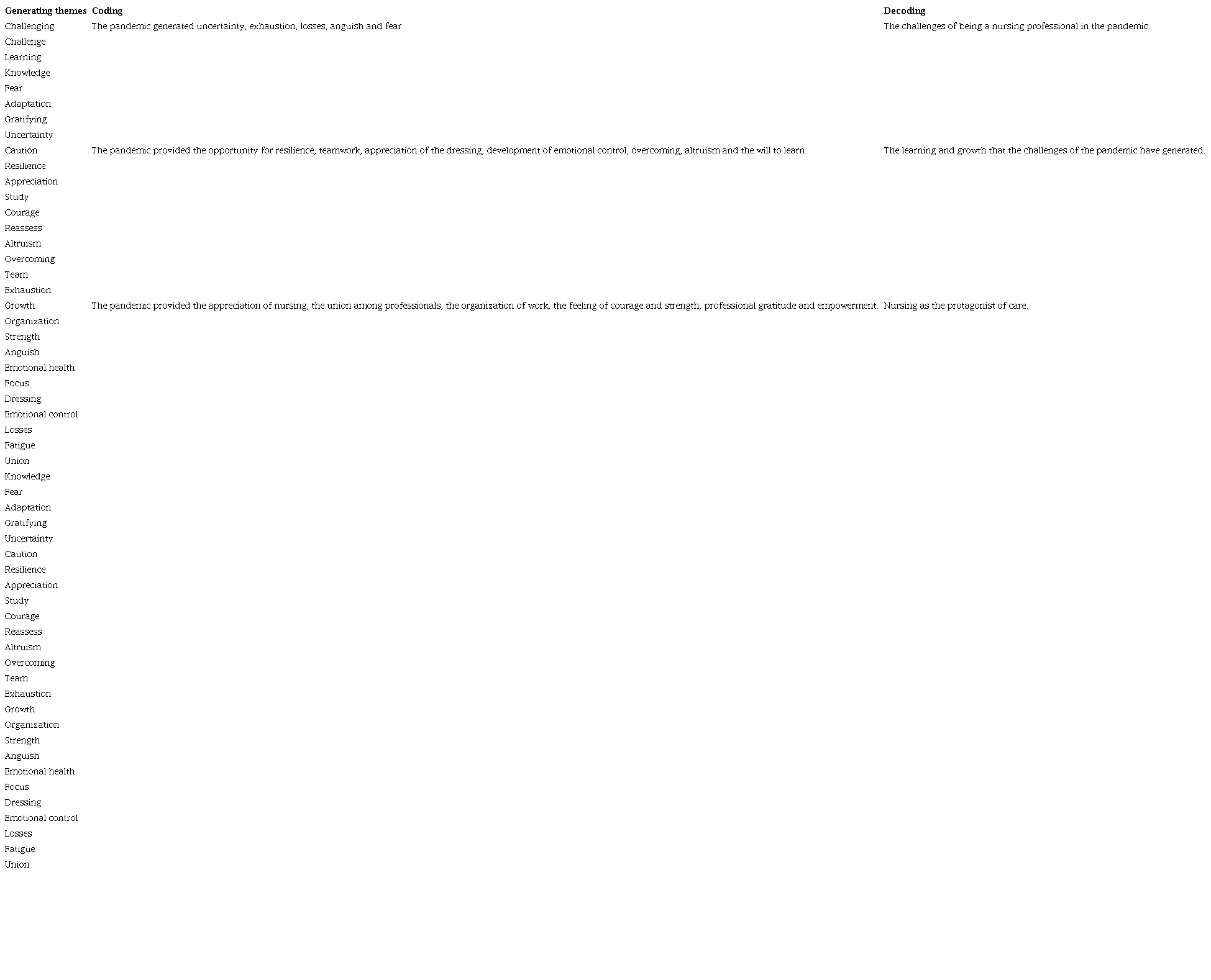 Accordingly, when combining the investigation of Generating Themes with the first step of NP, i.e., data collection, the interface with the second step of NP is followed through decoding. In this sense, it should highlight the Nursing Diagnoses (ND) whose clinical judgment allowed to list from the evidence that was organized by considering the coding and decoding procedures of VCC. In the same way that in the decoding step it is possible to reflect on the situation presented and how it is theoretically supported, leading to a broadening of understanding and the elaboration of a synthesis of ideas, in the step of clinical judgment (referring to the step of NP related to diagnosis identification), an analysis is made of the real health conditions that are being assessed and, from these characteristics, the clinical analysis sustained on scientific bases is undertaken, which allows materializing the diagnostic idea.10,15 Therefore, “the challenges of being a nursing professional in the pandemic”, one of the decoding steps worked on, were translated from the following diagnostic statement extracted from the taxonomy North American Nursing Diagnosis Association International (NANDA-I): 1) Stress overload related to repeated stressors characterized by impaired emotional health, negative impact of losses, exhaustion, insecurity. From a conceptual point of view, this diagnosis has the following meaning: Excessive amounts and types of demands that require action.15