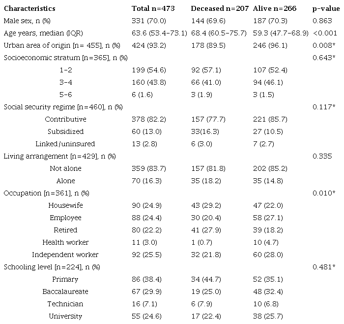 The majority of the patients (70%) were men, with a median age of 63.6 years, were from urban regions (93.2%), came from low socioeconomic strata (54.6%), were contributory regime members (82.2%), did not live alone (83.7%), and had a poor educational level (68.3%). 56.3 percent lived and 43.7 percent died. With a median age of 68.4 years, there was a substantial difference in prevalence, with a higher frequency in non-living persons (Table 1).