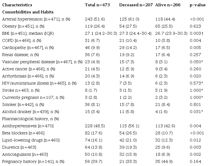 Among the observed antecedents, those who died had a higher incidence of comorbidities (statistically significant) than those who lived. Hypertension, chronic obstructive pulmonary disease-COPD-, cardiomyopathies, arrhythmias, and peripheral vascular disease were more common in the deceased. Similarly, the deceased had a greater body mass index-BMI- than the living.