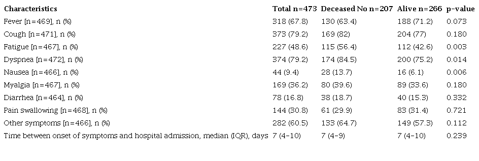 The most frequent symptoms at the time of admission were cough (79%), dyspnea (79.2%), fever (67.8%), and fatigue (48.6). Dyspnea and fatigue were more frequent in patients who died than those who did not. These data are similar to the data reported, for example, in the systematic review and meta-analysis conducted by Grant et al.,19 which included 138 studies conducted in nine countries. In that study, the most prevalent symptoms were fever (78%) and fatigue (31%).19 Nausea was frequent in our cohort but had a very low prevalence in the study by Grant et al.19