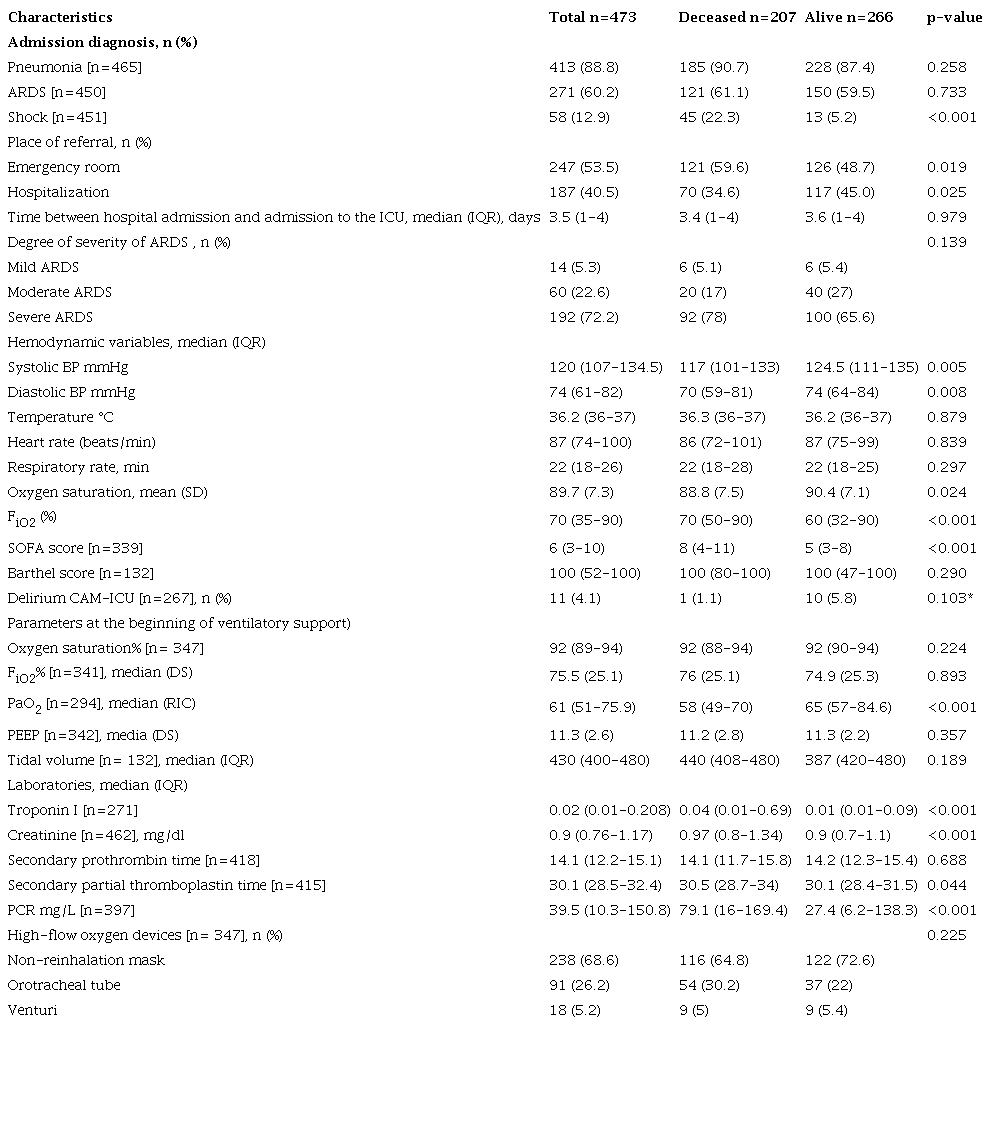 Results.: Of the patients included, 43.7% died, 88.8% had pneumonia, and 60.2% developed respiratory distress syndrome. Most of those who died were men. Those who died had a median age of 68.4 years and a higher frequency of comorbidities (hypertension, cardiovascular disease, chronic obstructive pulmonary disease, and higher body mass index). They were admitted to the ICU with higher rate of dyspnea, lower oxygen saturation, and higher score of multiorgan failure. They also more often required mechanical ventilation and pronation therapy and were given more vasopressors and renal replacement therapy.
