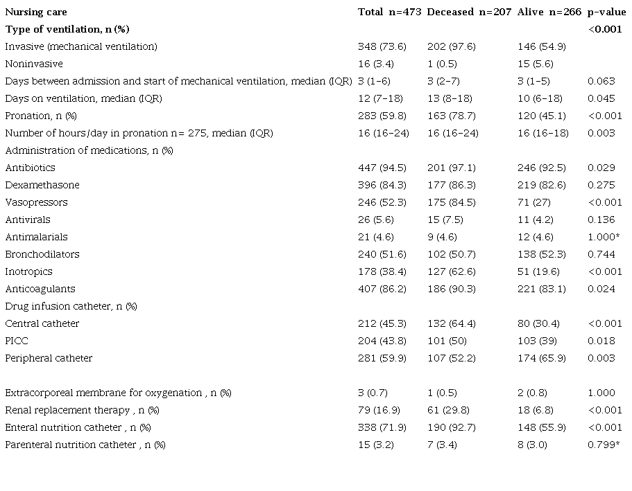 Methods.: Multicenter descriptive study of four high-complexity hospitals in Colombia, which included 473 consecutive adult patients admitted to intensive care units with a confirmed diagnosis of SARS CoV-2. Sociodemographic and clinical information - comorbidities, treatment and evolution - and nursing care provided were included.