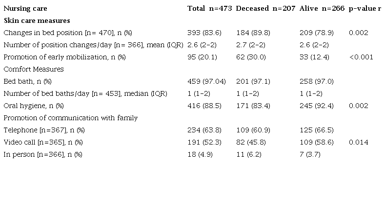 Oral hygiene, a basic part of nursing care, has been highly recommended in patients in the ICU on mechanical ventilation, since the oral cavity is considered a reservoir for cross-infection for caregivers and one of the routes of entry of microorganisms. In our study, oral hygiene was performed more frequently in living patients than in deceased patients. These results agree with those reported in the study by Kamel et al.,29 in which it was observed that a poor state of oral health, that is, with low hourly cleaning, was related to a greater severity of COVID-19. On the other hand, a high frequency of general bed bathing was maintained to provide comfort to patients. The data of this study give us information on the characteristics, clinical evolution, complications, and nursing interventions that were administered to adult patients hospitalized in four ICUs of Colombian hospitals.