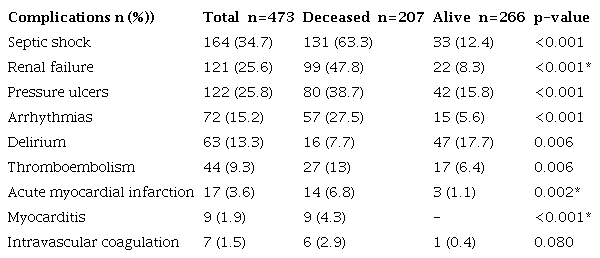 The hospital stay was 18 days in general (IQR 11-26), being longer in living patients than in deceased patients (19, IQR 11-29 vs. 17, IQR 11-22, p = 0.010). The median ICU stay was 12 days (IQR 6-19) and was also longer in the deceased (median 15, IQR 9-20 vs. 9, IQR 4-17, p≤0.001). Complications in the ICU are shown in Table 7. Among the most frequently identified in deceased patients compared to living patients were septic shock (63.3 vs. 12.4, p<0.001), renal failure (47.8 vs. 8.3, p<0.001), and thromboembolism (13.0 vs. 6.4, p=0.006). Pressure ulcers were also more frequent in deceased patients than living patients (38.7 vs. 15.8, p<0.001).