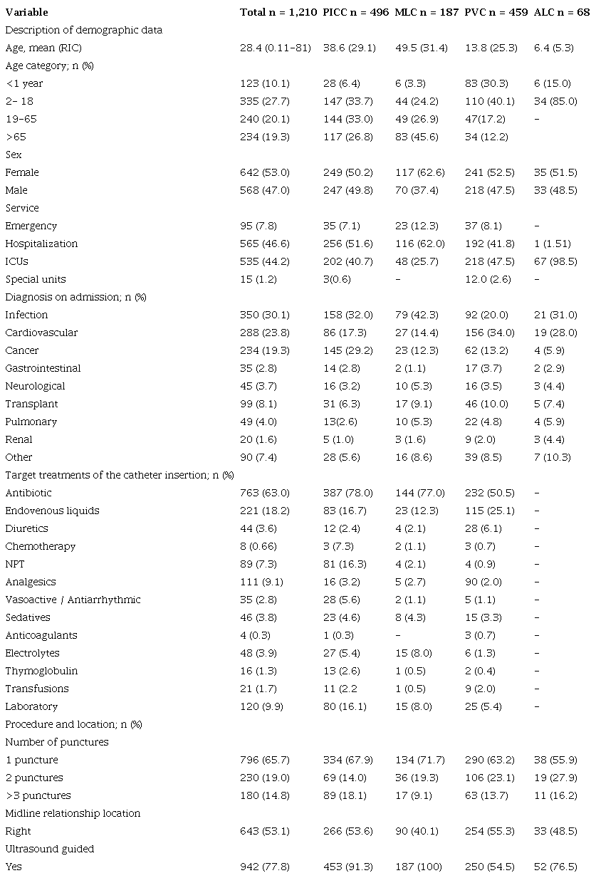 The analysis was descriptive type. The continuous variables included in the study were reported through means (standard deviation) or medians (inter-quartile range) according with the presence of marked asymmetry. The discrete variables were described in terms of counts (percentages). The types of catheters observed were peripherally inserted central catheter (PICC), peripheral venous catheter (PVC), Midline catheter (MLC) and arterial line catheter (ALC). The work included the rates obtained from events related with the catheter (95% confidence interval), and catheter-related infection rate (CIR) (number of events/catheter-days x1000).