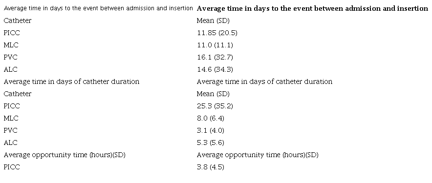 Average time at insertion and duration of the catheter. The time of opportunity, since the inter-consultation originated in the clinical services until verifying the catheter position after insertion of the PICC was 3.8 h. The average total time to catheter insertion by the group after hospital admission was 13.4 days. The shortest time to insertion since hospital admission was observed for the MLC insertion, while the longest insertion time was observed for the ALC (14.6 days). The average global time of catheter duration was 13.25 days (SD±25.2). The highest average catheter duration was the PICC with 25.3 days followed by the MLC (8.0 days), the ALC (5.3 days), and the PVC (3.1 days). (Table 2).