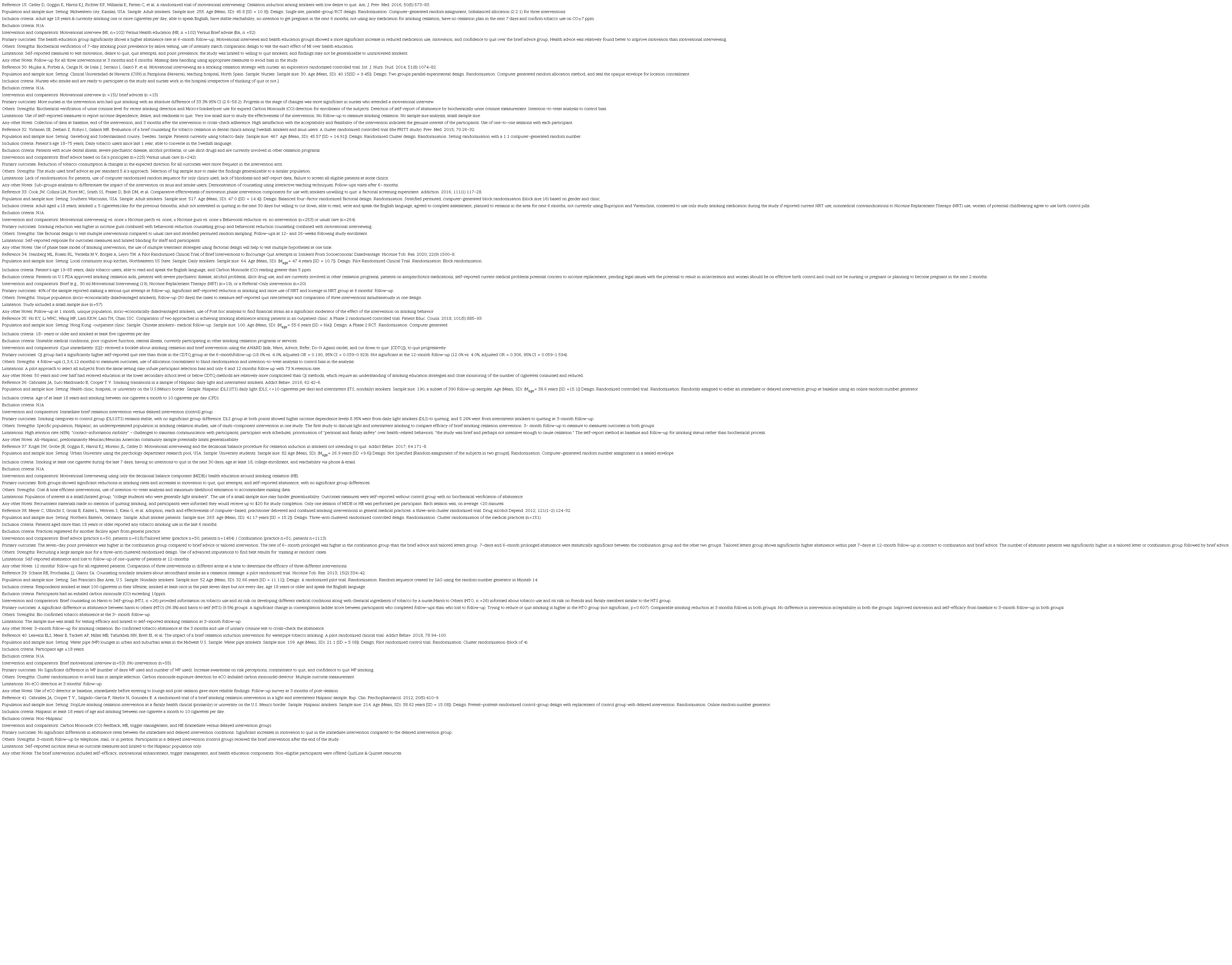 Métodos. : Para esta revisión sistemática, se buscaron en las bases de datos PubMed, Web of Science y PsychINFO ensayos controlados aleatorizados sobre el efecto de una intervención breve y/o una entrevista motivacional en la reducción del consumo de tabaco entre adultos sanos, que hubieran sido publicados entre el 1 de enero de 2011 y el 1 de enero de 2021. Los títulos y los resúmenes de los artículos incluidos fueron evaluados por dos revisores independientes para determinar los criterios de elegibilidad, se analizó la calidad de los estudios con la guía CONSORT y se utilizaron los criterios de Cochrane para evaluar el riesgo de sesgo.
