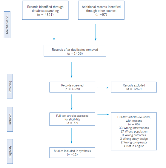 The electronic search produced a total of 3162 articles. 1406 articles were found suitable after removing duplicate records. Abstracts of all articles were reviewed independently by two reviewers. A total of 1262 articles were excluded after careful scrutiny of abstracts. Full-text articles were retrieved for 79, and after reviewing these articles independently, 67 articles were further excluded for a specific reason. After applying the eligibility criteria, 12 articles were included in the present review. The PRISMA flow diagram (Figure 1) summarizes the study selection and scrutiny process used for the articles. A summary of the selected studies summarized by year of publication, author, setting, type of study, sampling techniques, sample size, eligibility criteria (inclusion and exclusion), intervention, outcomes, strengths and limitations, and any other specific notes to the study.