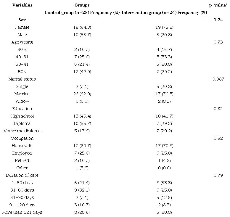 Fifty-two caregivers of the hemodialysis patients were divided into intervention (n=24) and control (n=28) groups (Figure 1). The majority of caregivers in the intervention 19 (79.2%) and control 18 (64.3%) groups were female. 17 patients in the intervention group (70.8%) and 26 in the control group most of the caregivers (92.9%) were married. However there was no significant difference between the groups in terms of demographic characteristics. It suggests that both groups are similar in terms of demographic characteristics (Table 1).