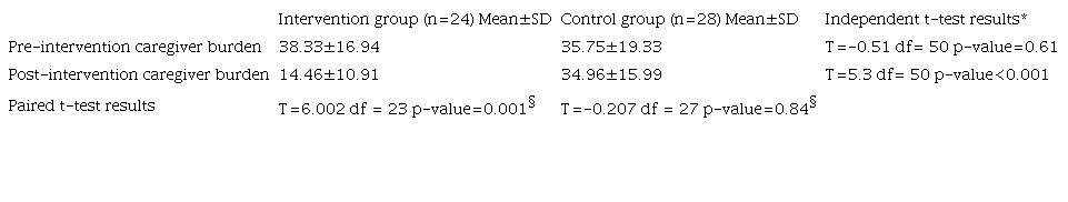 Based on the results of independent t-test before the intervention, there was no significant difference between the two groups in terms of the mean caregiver burden of caregiving (p>0.05).