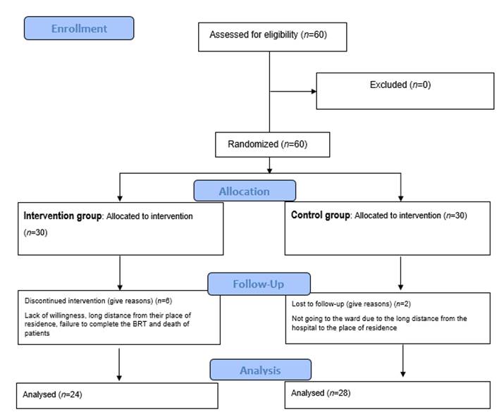 Six caregivers of hemodialysis patients in intervention group did not continue the study due to lack of willingness, long distance from their place of residence, failure to complete the BRT and death of patients; also, two caregivers in the control group did not return to the ward to complete the post-test because of the long distance from their place of residence. Eventually, 24 caregivers in the intervention group and 28 in the control group completed the study.