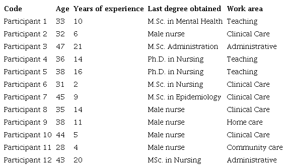 The study had the participation of 12 male nurses working in the city of Medellín, ranging in age between 28 and 47 years and average time of 11 years of professional experience (Table 1).