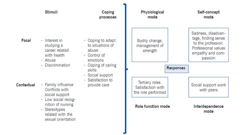 Methods. : Secondary analysis of data from a collective case study that had as participants 12 male nurses working in the city of Medellín, with ages between 28 and 47 years and average time of professional experience of 11 years. Information collection was carried out through in-depth interviews. The analysis was conducted through Roy’s Adaptation Model (RAM), reading of the interviews, identification of RAM’s components, grouping of fragments, assignment of tags, construction of a matrix and classification.