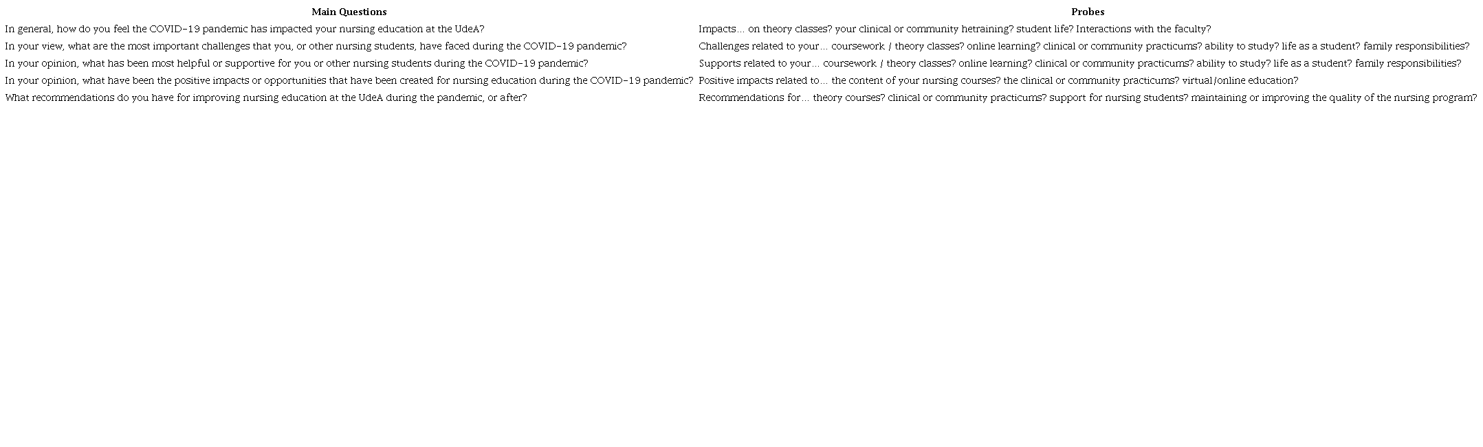 Data collection occurred concurrently with recruitment and took place between November and December 2021. Individual, in-depth interviews via the video conferencing platform Zoom were conducted by the first author (a female registered nurse and Masters’ of Global Health Nursing student) using a semi-structured interview guide with probes. Each student was interviewed once, and all interviews were conducted in Spanish (the interviewer’s first language) at a time and private location of the students’ choosing. The first author received training in interviewing techniques and pilot-tested the interview guide with three Spanish-speaking students prior to participant recruitment. The interview questions addressed participant’s perceptions of the impact of the COVID pandemic on their nursing education; challenges faced during the pandemic; support for students during the pandemic; positive impacts or opportunities created for nursing education during the pandemic as well as recommendations for improving nursing education at the university (Table 1). Interviews lasted between 45 and 60 minutes. In the event of major issues related to internet connectivity, participants were offered the opportunity to close their cameras or continue the interview at a later date.