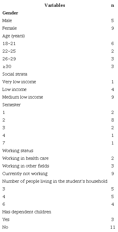 A total of fourteen participants were recruited and completed the online interview. The demographic characteristics of the participants are presented in Table 2. Most were in their first year of the program in March 2020, when pandemic restrictions required all classes to be shifted online. At the time of the interviews in the autumn of 2021, all courses and clinical placements were still being conducted virtually, and only final year students were able to attend their clinical practicums in-person. All participants were full-time students, and the majority (n=9) were female, three of whom were single mothers. Six students were between 18 and 21 years old, while three were at least 30 years old. All participants identified as low-income, belonging to the the three lowest income brackets from Colombia’s socioeconomic strata of 1(very low) to 6 (high). Five participants were working part-time while in school, including two who worked in a healthcare facility with COVID-19 patients. Despite multiple e-mailed invitations during the participant recruitment phase, no nursing students who were in their 5th, 6th, or 8th (final) semester in March 2020 volunteered their participation.