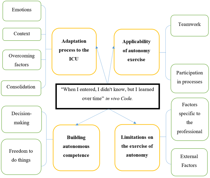 In the participants' discourse, it emerged that achieving professional autonomy requires an adaptive process to the ICU, involving different stages from their initial entry. Nurses exercise autonomy when they are confronted with situations that require leadership and the fulfillment of objectives supported by knowledge, leading them to develop their critical capacity to make decisions and projecting a problem-solving image during events. This, in turn, involves a process of learning, maturation, and dynamic social interaction with shared objectives among healthcare team professionals, enabling them to acquire, strengthen, and consolidate competencies, skills, and abilities.