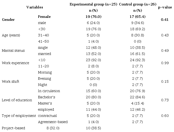 Most of the nurses in the experimental (76%) and control (65.5%) groups were female. Moreover, a majority of the participants in the experimental (76%) and control (69.2%) groups were below 10 years of age. In the experimental (92%) and control (92.3%) groups, most of the nurses had <10 years of experience. Most of the nurses in the experimental (60%) and control (84.6%) groups had work shifts in circulation, and most of the participants were undergraduates (80% in the experimental group and 84.6% in the control group). The chi-square test results revealed no statistically significant difference between the two groups in terms of demographic variables (p>0.05) (Table 1).