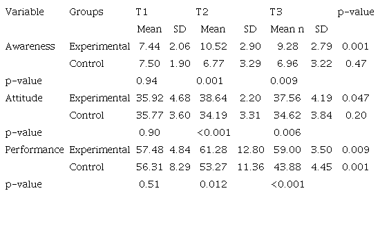 Resultados: El análisis de los datos mostró diferencias estadísticamente significativas entre los dos grupos en los momentos inmediatamente y dos meses después de la intervención (p<0.05). En el grupo experimental, los cambios en la puntuación media de conocimientos, actitudes y rendimiento de las enfermeras se observaron en los momentos de antes, inmediatamente y dos meses después de la intervención (p<0.05); mientras que en el grupo de control solamente los cambios en la puntuación media de desempeño fueron significativos (p<0.05).