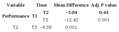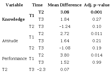 Regarding the comparison of the mean score of the nurses’ awareness, attitude, and performance in preventing NI between the experimental and control groups before (T1), immediately (T2), and two months after the intervention (T3), the t-test findings indicated no statistically significant difference prior to the intervention (p>0.05); however, the differences between the two groups was statistically significant immediately after and two months after the intervention (p<0.05) (Table 2). So that immediately and two months after the intervention, the mean score of knowledge, attitude and performance of nurses were significantly higher in the intervention group than in the control group. Also, the results of the analysis of variance with repeated measurements showed that in the experimental group, the changes in the mean score of knowledge, attitude and performance of nurses before, immediately and two months after the intervention were significant, but in the control group, only the changes in the mean score of performance were significant and the changes in the mean score of their awareness and attitude have not been significant (Table 2). The paired comparison of mean score according to the study times in the experimental group showed that the changes in the mean score of knowledge, attitude and performance of nurses increased significantly only immediately after the intervention compared to before the intervention (p<0.001) (Table 3). Also, the paired comparison of mean score according to the study times in the control group also showed that the changes in the mean score performance of nurses two months after the intervention compared to before (p=0.001) and immediately (p=0.001) after the intervention were significantly reduced (Table 4).