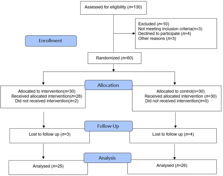 In this randomized controlled trial study, the intervention was implementing an educational HBM-based program. This study was conducted in 2022 for three months at the Imam Reza Hospital in Larestan. The statistical population encompassed 130 nurses employed in this hospital. The sample size in each group regarding the error type I of 0.05, the effect size of 0.784, the power of 90%, and 10% attrition was 30 persons.25 In total, 60 nurses were selected using the simple random sampling method and assigned to two experimental and control groups. Inclusion criteria were holding at least a bachelor's degree in nursing, willingness to participate in this research, and employment in the concerned hospital as a clinical nurse. Exclusion criteria were also as follows: unwillingness to participate or continue the study, incomplete questionnaires, and being absent for more than two training sessions. The dropouts were five persons in the experimental group (because of being absent in training sessions and incomplete questionnaires; n=25) and four persons in the control group (because of incomplete questionnaires and pregnancy weakness; n=26).