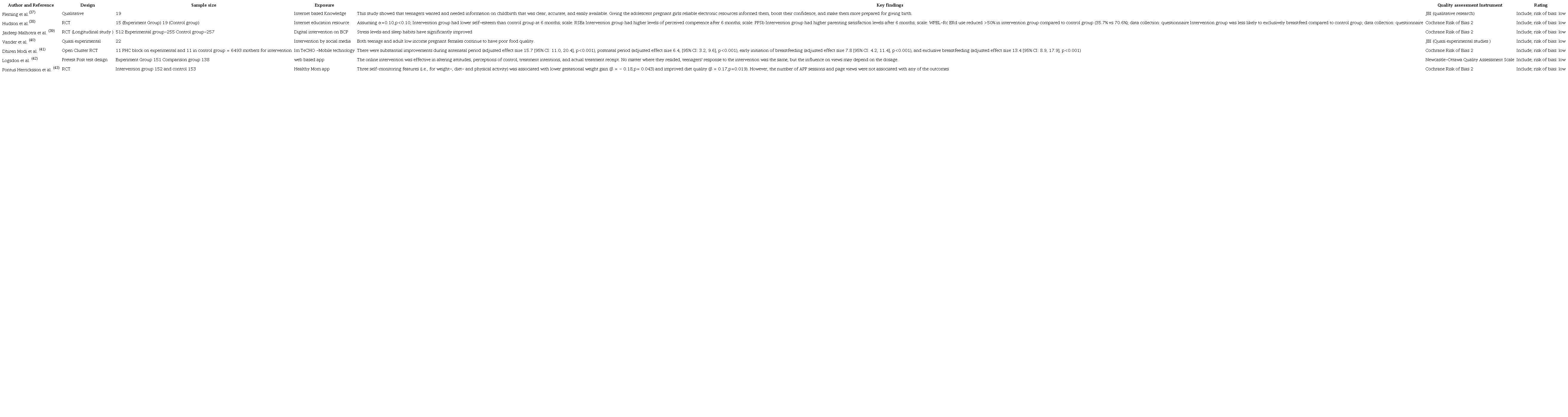 Synthesis of Results. The studies are summarised in Table 1. Adolescent girls in five studies received active intervention.39-43) Of these studies, one dealt with contacts between adolescents and medical professionals,38 two with interactions between adolescents38,40 and the final two dealt just with online material.37,38) Synthesis of results followed convergent synthesis where numerous outcomes gathered both before and after the intervention, and were assessed using self-reports, post intervention questionnaires and results targeting the research questions which specifically discussed in three sections which are the use of digital applications, Outcomes for the mothers and outcome for the neonates.