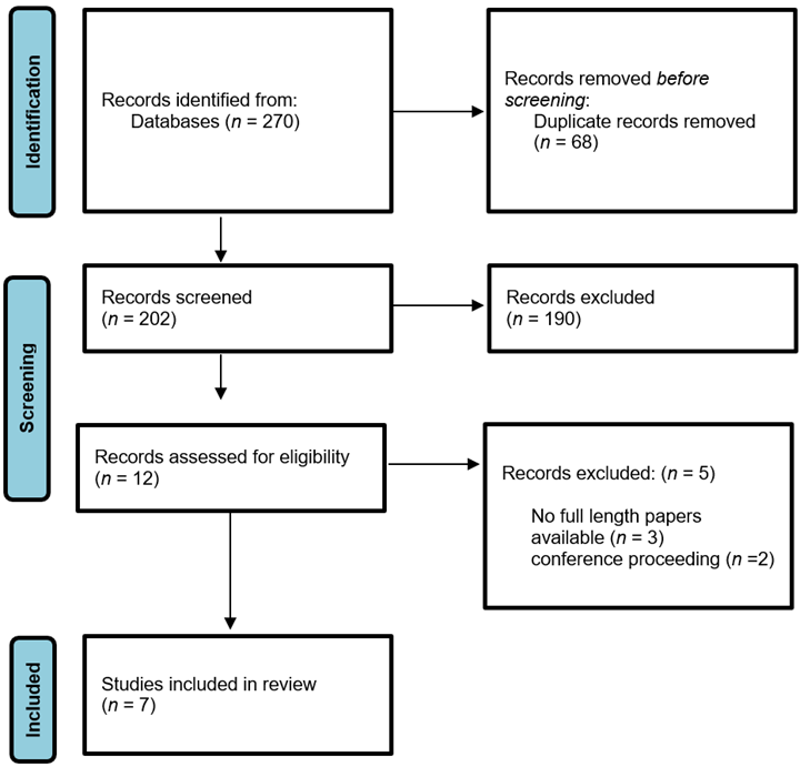 Search Results. A Boolean search for relevant phrases was performed yielded altogether 270 records. This restricted the number of records to 122 in CINAHL, 88 in Medline, and 70 in PubMed. Diagrams of PRISMA's flow were made as displayed in Fig 1. A few things were eliminated since they weren't pertinent to the subject of the study. After removing the duplicates, the abstracts of each publication were examined. 68 duplicates were removed and hence 202 records were found suitable and eligible for next screening. 2 independent authors performed the screening where 190 records were excluded with reasons (interventions were not based on online or digital platform n=92, age group more than 25 years n=88, interventions was not related to desired outcomes n=10). Out of the left over 12 articles, 5 articles removed as no full length paper was available (n=3), and conference proceeding (n=2).