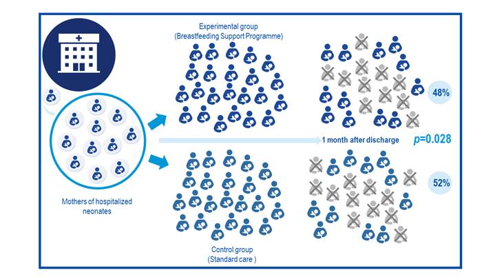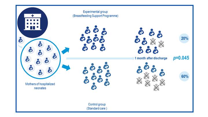 It is necessary to know whether or not this finding, in addition to being a statistically significant difference, has any clinical value. Reviewing the results, it is confirmed that abandonment of breastfeeding one month after hospital discharge in the experimental group was 20%, while in the control group it was 60% (Figure 1). This drastic reduction in abandonment of breastfeeding in the experimental group could be considered relevant given the known benefits of breastmilk in different settings, both for the mother and child, which supposes that the potential population benefitted would justify implementing a program within the hospital context, like the one studied. Additionally, the researchers have reported a p value = 0.045, which under the conventional assumption of the limit value assigned to it of 5% (0.05), also corroborates statistical significance.