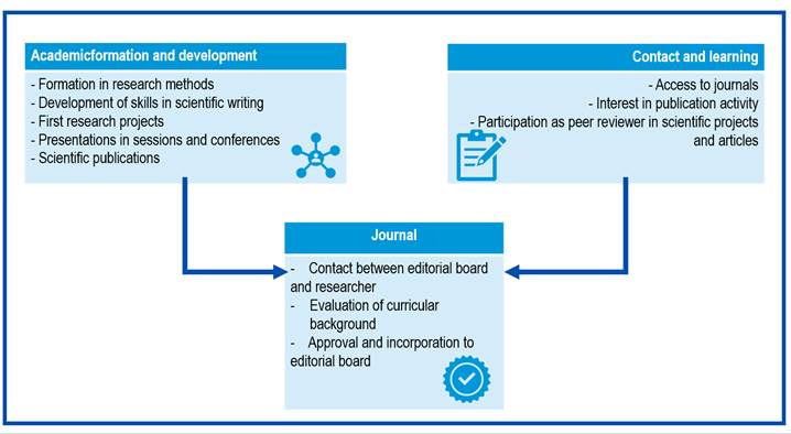 Further, in the construction of a specific academic profile, one comes across attractive journals and on which one projects the intention of being part of them. In my experience, in the early 2000s, I had the opportunity to hold an issue of the journal Investigación y Educación en Enfermería. Due to the themes and quality of the works, as well as the editorial line and aspects of style, my aspiration arose to be part of the Journal. In this experience and from these two perspectives, two approaches come together as a basis for meeting the basic conditions to be part of an editorial board. As illustrated in Figure 1, essential conditions and experiences are needed to meet the requirements to join these boards.