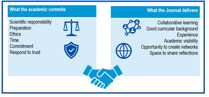 With the foregoing, and from an analysis of a reciprocal relation, it is possible to establish that in the interaction between editorial board members and the journal commitments and mutual benefits are integrated (Figure 2).