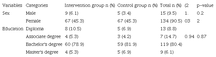 Among the 148 participants in this research, 76 were assigned to the intervention and 72 to the control group. The mean age of the nurses was 33.88±7.24 years (R=22-52). Their mean length of work experience was 10.57±8 years (R=1-27). No statistically significant difference was found between the two groups before the intervention in terms of age, sex, work experience and education. (Table 1)