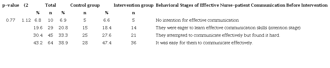 Results: In the pretest, no statistically significant difference was found between the intervention and control groups regarding the behavioral stages of effective communication with patients. In the posttest, the mean task self-efficacy score was significantly increased in the intervention group compared to the control (p<0.001). The mean coping self-efficacy score was also significantly higher in the intervention group than the control in the posttest (p<0.001). Moreover, the mean coping planning score was significantly increased in the post-test intervention group(p<0.001). The mean communicative skill score was also significantly increased in the intervention group compared to the post-test control (p=0.03).