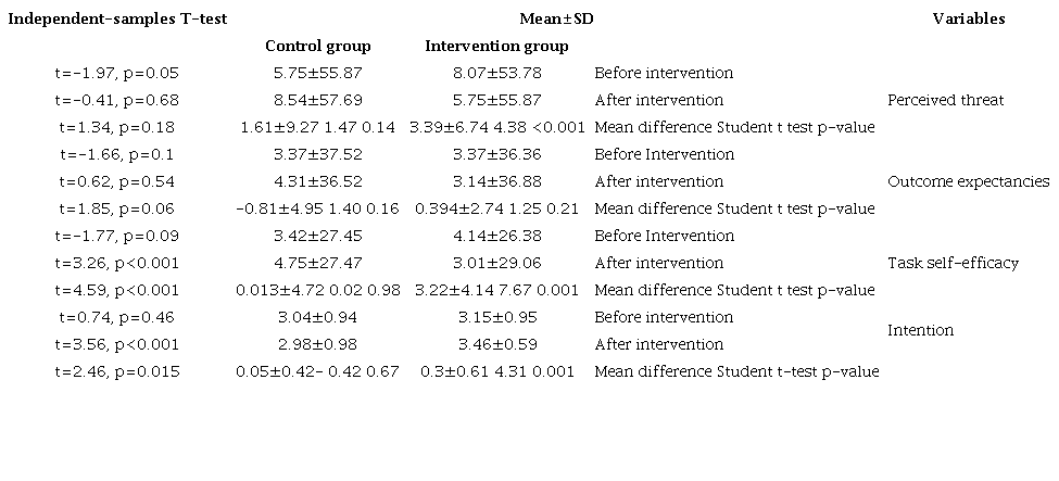 The results indicated in Table 2 show the difference between the research groups in the behavioral stages before the intervention in the pretest. Overall, in both groups, 6.8% belonged to the pre-intention, 19.6% to the Intention, and 75.9% to the behavioral stages. Moreover, according to Table 3, no one from the intervention group was in the pre-intention stage after the motivational intervention. The nurses' affiliation with the behavioral stages was significantly different from the control group (p<0.001). As shown in the Table 3, the mean score of perceived threat was significantly higher in the control group before the intervention (p=0.05). Also, the motivational intervention led to no significant increase in the outcome expectancy in the intervention group (p=0.21). However, the increased mean difference in this group was statistically significant compared to the control group (p=0.06). The mean scores of behavioral Intention, task self-efficacy, and behavior planning in the two groups were not significantly different before the intervention, after the motivational intervention and the planning intervention, the mean scores of behavioral Intention (p<0.001), task self-efficacy (p<0.001) and behavior planning (p<0.001) showed a statistically significant increase in the intervention group compared to the control