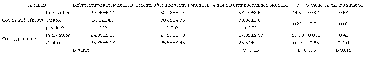 The mean score of coping self-efficacy in the intervention group one and four months after the intervention was significantly increased. The effect size was high (p<0.001). This increased difference was not observed in the mean score of the control group (p=0.64). The intervention in the volitional phase and stress management programs led to an increase in the mean coping self-efficacy score among nurses in the intervention group. The increased mean score of coping planning was a statistically significant one and four months after the intervention (p<0.001). This difference between the mean scores of nurses in the control group was not statistically significant (p=0.95) (Table 5).