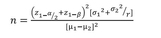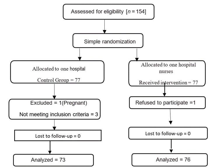 To prevent education bias and its effect on the control group, nurses from one hospital were assigned to the intervention group and those from the other hospital to the control group. Therefore, one hospital was randomly selected for the intervention and the other for the control. The randomization was performed using a coin flip, resulting in one hospital being selected as the intervention group and another as the control group. The sample size in each group was estimated at 61 with an attrition rate of 20% [n=13], an estimated error of α=0.05 and β=0.2. It was estimated at 74 using the following formula. Therefore, a total number of 148 was finally set.