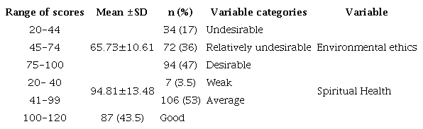 The results of the current study showed that the mean score for environmental ethics among students was 65.73±10.61 out of 100. Most students (47%) had desirable environmental ethics in the classification of environmental ethics. Based on the results, the mean score for spiritual health was 94.81±13.48 out of 120. Most students (53%) had average spiritual health (Table 2).