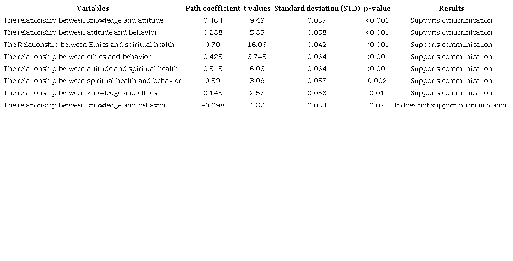 Table 4 provides the results of the significance test for the path coefficient of the structural model. As observed, the t-values were greater than 1.64, indicating that the hypotheses are confirmed at the 90%, 95%, and 99% confidence levels. Knowledge (β=0.46) predicted environmental ethics (p<0.001), and environmental ethics (β=0.14) correlated with environmental behavior (p<0.001). Furthermore, attitude (β=0.28) and spiritual health (β=0.31) predicted environmental behavior (p<0.001), and spiritual health predicted environmental ethics (B=0.28, p<0.001). Also, environmental ethics predicted environmental behavior (β=0.42, p<0.001). Figure 1 illustrates the path coefficients and their significance between variables that predict environmental behavior.
