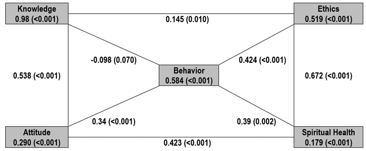 Table 3 demonstrates the relationship between demographic variables and environmental structure. Clearly, a significant positive correlation was found between age and knowledge (r=0.17, p<0.001). Environmental ethics was strongly correlated with attitude (r=0.48, p<0.001), spiritual health (r=0.61, p<0.001), and environmental behavior (r=0.58, p<0.001). Additionally, knowledge showed a significant positive correlation with environmental ethics, indicating that an increase in knowledge was associated with an increase in environmental ethics (r=0.14, p<0.001).