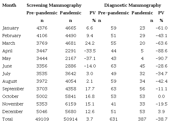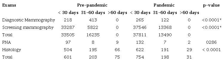 Results.: During the pandemic period, there was a greater number of screening mammograms (+3.68%), cytological (+23.68%), histological (+10.7%) and a lower number of diagnostic mammograms (-38.7%). The time interval for carrying out the exams was up to 30 days for screening and diagnostic exams and more than 60 days to start treatment during the pandemic period.