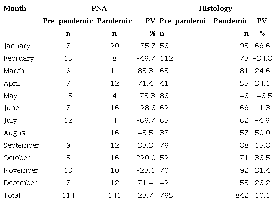 Cytological and histological examinations showed a difference of 27 FNA and 77 histologies performed in the pre-pandemic period in relation to the pandemic context, with an even greater drop in May -73.3% and -46.5%, with an increase in October for FNA 220% and in January for histology 69.6% (Table 2).