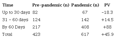 Resultados.: Se observó un mayor número de mamografías de cribado (+3.68%), citologías (+23.68%) e histologías (+10.7%) y un menor número de mamografías diagnósticas (-38.7%) en el período pandémico. El tiempo para la realización de las pruebas fue de hasta 30 días para el cribado y diagnóstico y de más de 60 días para el inicio del tratamiento durante el período pandémico.