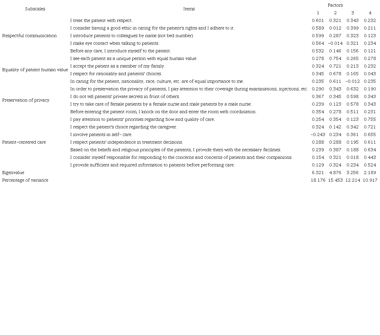 In this section, the developed questionnaire was completed by 203 nurses with the remaining 29 questions. The demographic characteristics of the nurses are given in Table 1. Then, to determine the number of factors, exploratory factor analysis was performed. KMO statistic was performed for sampling adequacy which was 0.9231. The Bartlett sphericity test was significant (p = 0.001). To extract the factor structure of the questionnaire, principal component analysis and varimax rotation were performed with Eigenvalue> 1. The factor loading of each item was considered at least 0.5. 16 Of the initial 29 items, 9 items were omitted due to a factor loading of less than 0.5. Thus, the final questionnaire with 20 items and 4 factors including respectful communication (5 items), equality of patient human value (4 items), preservation of privacy (4 items) and patient-centered care (7 items) was obtained (table 2). The variance of 4 factors was 56.76%. Scoring. The items of the HDQ were rated on 5-point Likert-type scale from 1 to 5, 1 = never, 2 = rarely, 3 = sometimes, 4 = often, and 5 = always. The range of scores of this questionnaire is 20-100, so that a higher score indicates more observance of human dignity in nursing care.