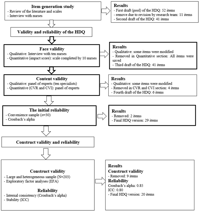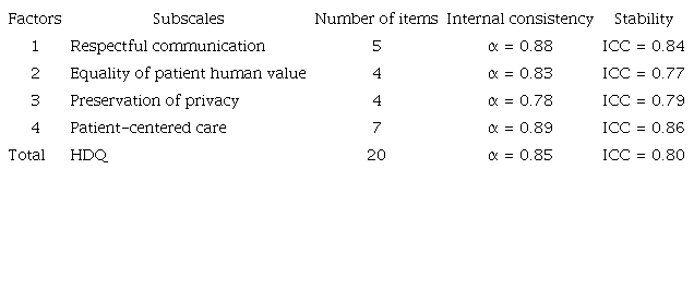 The final reliability. The internal consistency of the HDQ for 20 items using Cronbach's coefficient alpha was obtained 0.85. The stability of the HDQ using the ICC was calculated 0.80, which indicates that the HDQ has good stability over time. Internal consistency and ICC for 4 factors are listed separately in Table 3.