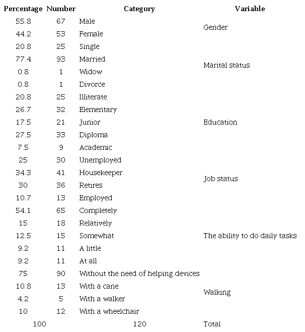 The mean age of the participants in this study was 49.85 ± 12.74 years, the average duration of dialysis was 43.23 ± 8.51 months, and the average number of the sessions was 0.53 ± 2.73 sessions per week. The majority of the sample were men (55.8%), married (77.4%) with diploma education (27.5%) and retired (30%). The study samples were often completely capable of doing their daily tasks and were able to walk without any equipment (75%). (Table 1)