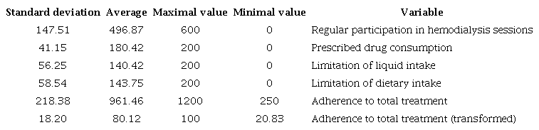 As to adherence to the treatment, the mean and standard deviation of the subscale of regular participation in the hemodialysis sessions was 496.87±147.51, consumption of prescribed medication was 180.42±41.15, limitation of fluid intake was 140.41±56.25, limitation of the dietary intake was 143.75±58.54, general treatment adherence was 961.46±218.38, and total treatment adherence (transformed) was 80.12±18.20. The highest average value belonged to the subscale of regular participation in the hemodialysis sessions, and the lowest average value belonged to the subscale of the limitation of fluid intake. (Table 2(