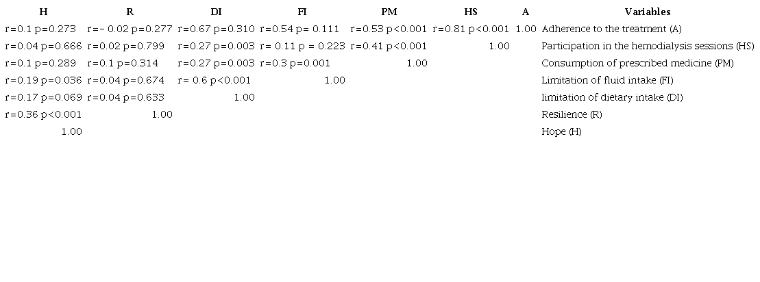 Results.: The finds showed that the levels of resilience, hope, and adherence to treatment had hight level. More specifically, it was indicated that the mean and standard deviation for the total resilience score, the hope variable, and adherence to total treatment was 75.45±14.34, 40.43±3.66, and 80.12±18.20, respectively; which have maximum possible scores of 100, 48 and 100. Thus, it can be said that no correlation was observed between resilience and adherence to treatment variables (p>0.05); hope variable and adherence to treatment (p>0.05), and adherence to treatment with hope and resilience variables (p>0.05). However, hope and resilience variables showed a direct and weak correlation with each other (r=0.36, p<0.05); that is, patients who had more hope indicated better resilience as well.