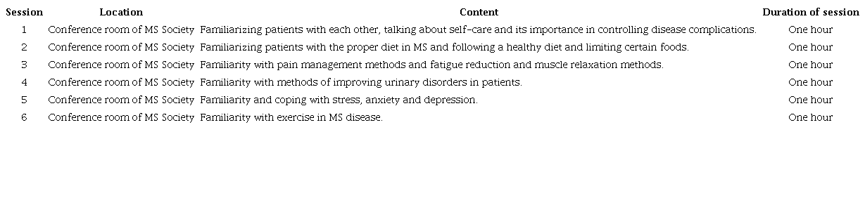 The content of the six training sessions in both the regular Lectures method and TMTD was as follows: The first session: Familiarizing patients with each other, talking about self-care and its importance in controlling disease complications. The second session: Familiarizing patients with the proper diet in MS and following a healthy diet and limiting certain foods. The third session: Familiarity with pain management methods and fatigue reduction and muscle relaxation methods. The fourth session: Familiarity with methods of improving urinary disorders in patients. The fifth session: Familiarity and coping with stress, anxiety and depression and the sixth session: Familiarity with exercise in MS disease (Table 1). After the completion of the educational sessions, the patients in the intervention groups were followed up for one month, and during this period, the researcher attended the MS Society and answered the patients' questions by phone and in person. Immediately and one month after the intervention, the self-efficacy questionnaire was completed by the patients of all three groups. Patients in the control group did not receive education.