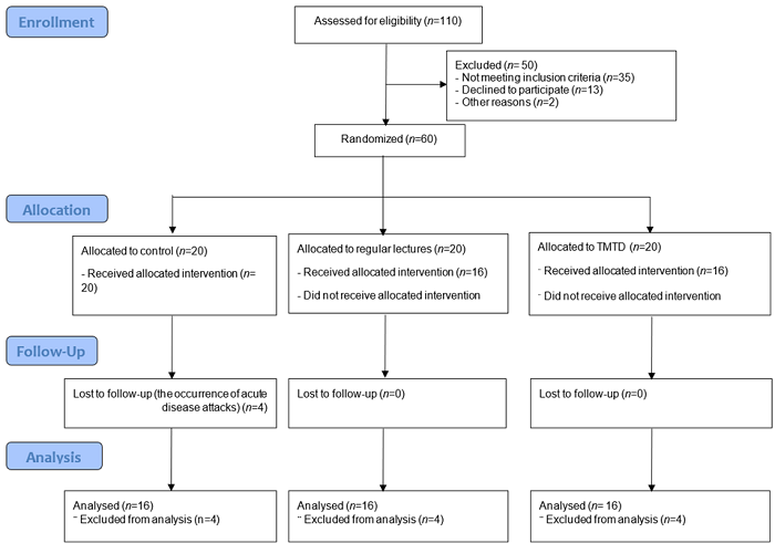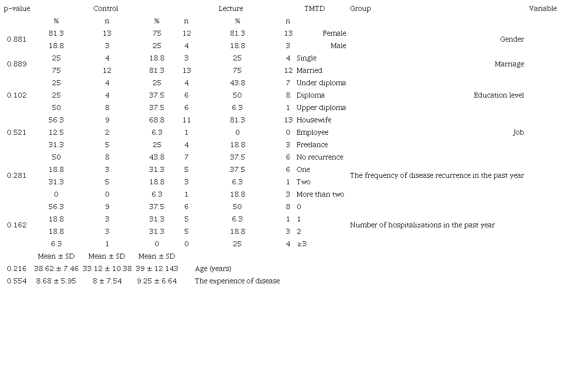 12 patients (total of 60 patients) were excluded from the study due to reasons such as absence in the training sessions and occurrence of acute disease attacks. Therefore, the findings were analyzed with 16 patients in each group (48 patients in total). The analysis of the findings showed that the patients in the intervention and control groups were identical in terms of demographic variables. The average age of the patients in the TMTD group was 39 ± 12.143, the regular lecture group was 33.12 ± 10.38, and the control group was 38.62 ± 7.46, which had no significant difference. Other demographic characteristics are given in Table 2.