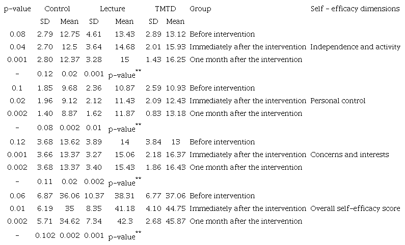 The results of the Kolmogorov Smirnov test showed that the data in the intervention and control groups had a normal distribution before, immediately and one month after the intervention. Therefore, parametric tests of multivariable analyze of covariance, paired t-test and repeated measurement test were used to analyze the data. The results of the repeated measurements showed that the mean of the self-efficacy and its dimensions in both TMTD and regular lectures methods immediately and one month after the intervention had a significant increase compared to before the intervention, while no such change was observed in the control group (Table 3).